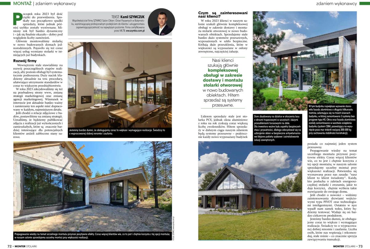 Początek roku 2023 był dość ciężki do przewidzenia. Spotkały nas początkowo spadki sprzedaży, które jednak później szybko zostały wyrównane. Miniony rok był bardzo dynamiczny i – jak się finalnie okazało – dobry pod względem liczby zamówień. Głównie montowaliśmy stolarkę w nowo budowanych domach jednorodzinnych. Pojawiło się też coraz więcej usług wymiany stolarki w istniejących już budynkach.